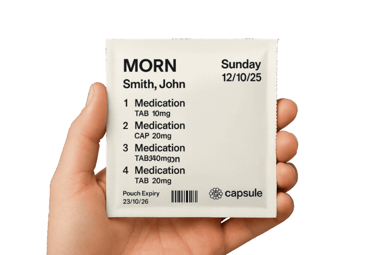 Capsule Pharmacy takes care of everything for you from start to finish. We order your prescriptions directly from your GP, prepare your medication safely in our pharmacy, and deliver it straight to your door. Depending on your needs, your medicines can be supplied in easy-to-tear pouches, weekly dosette boxes, or in their original packaging.